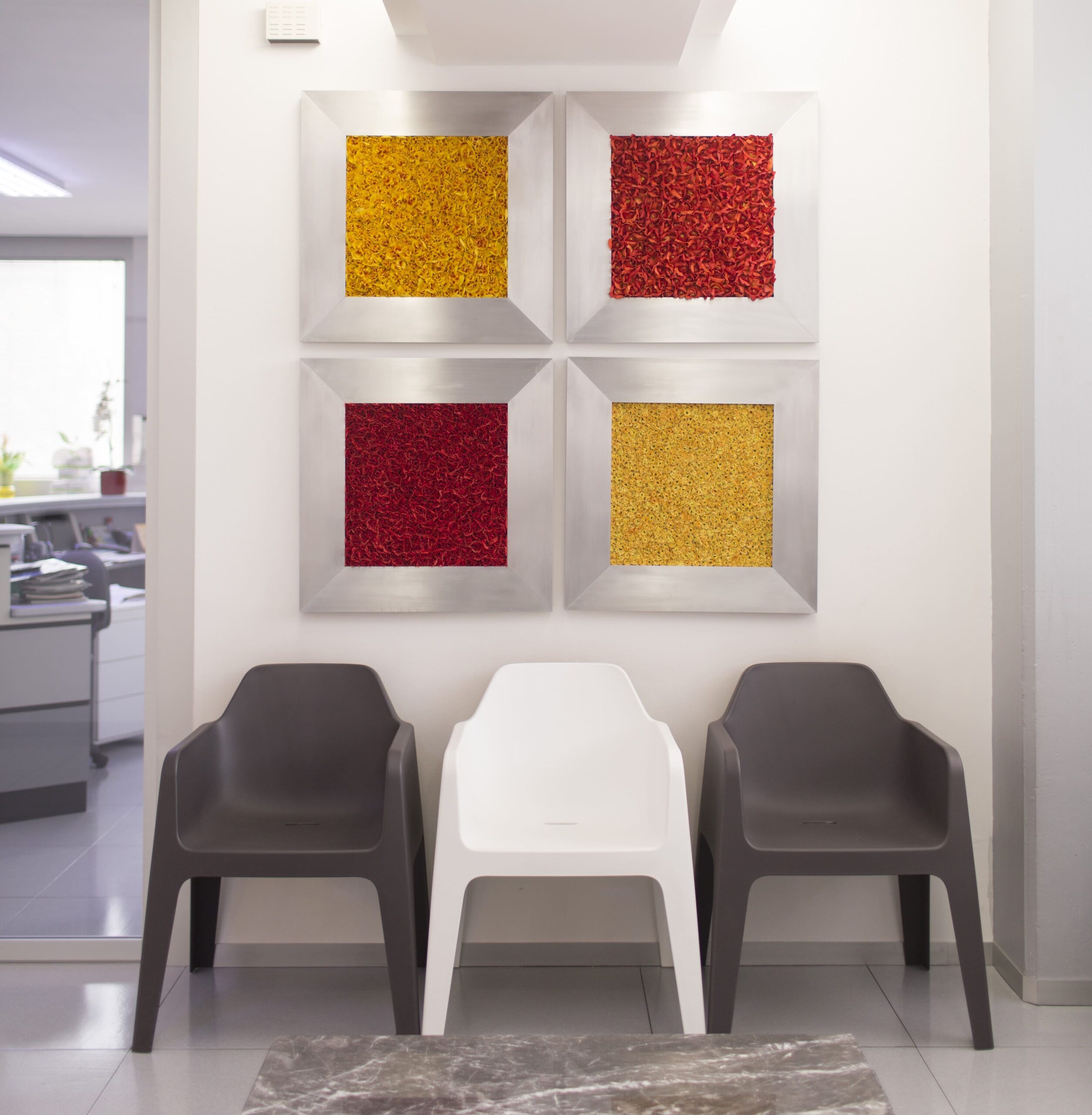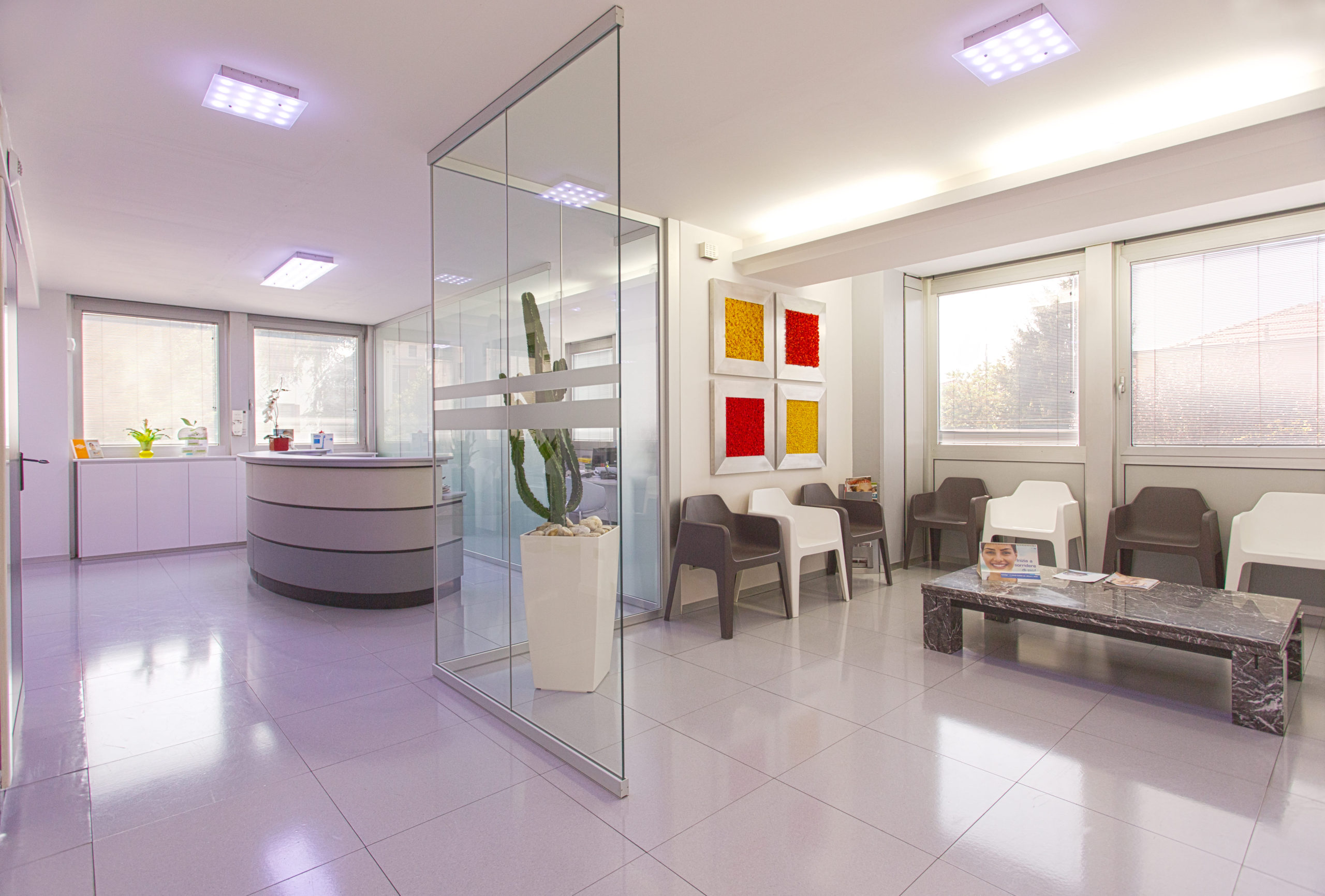 Al piano interrato sono presenti il laboratorio odontotecnico e la sala di radiologia. Il piano terra è una zona adibita ai servizi interni come ad esempio la sala corsi, la mensa e lo spogliatoio riservato ai dipendenti della struttura. Al primo piano incontriamo la reception, formata da un Front Office e un Back Office, e superata un’ampia sala d’attesa si entrerà nelle zone operative dove sono presenti i reparti di igiene dentale, conservativa, pedodonzia, endodonzia e ortodonzia. Il secondo piano è composto dall’Ufficio Acquisti e HR (Human Resource) e superata la sala d’aspetto dai reparti di protesi e chirurgia.